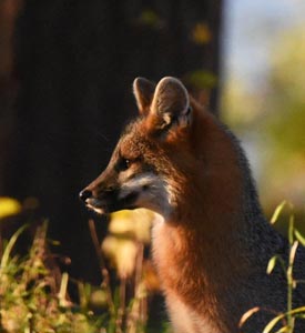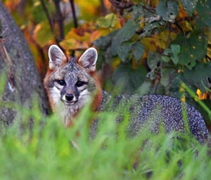 Ein Graufuchs beobachtete ein Reh nonchalant beim ‚Grasen‘ von Vermont-Ahorn Blättern in 10 Fuß Entfernung, rannte aber davon, als das Junge auftauchte.