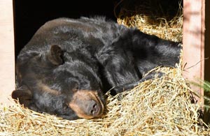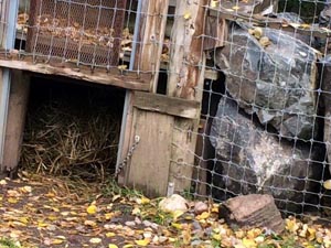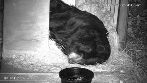 Es gibt keine Bilder, aber heute früh öffnete Sharon die Tür zwischen Luckys und Hollys Gehege. John Leonard gab jedem Bär ½ Ballen Stroh. Es geschah nicht viel. Lucky kam schließlich herüber und nahm sich Hollys Stroh. Sharon meinte, dass Lucky vorsichtig war und sie nicht denkt, dass die beiden zusammen überwintern werden. Sie könnte die Tür über das Wochenende offen lassen, aber sie sagt, dass beide sich in ihren eigenen Höhlen eingerichtet hätten.