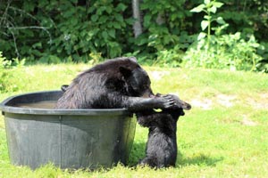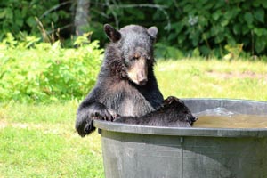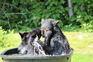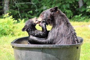 Von einer örtlichen Futterstation wurden mir Bilder von Fern und ihren Jungen vom letzten Jahr – 03. August 2016 – geschickt. Das ist ein Beispiel dafür, darum die Gemeinschaft die Bären so liebt. Das ist, warum Nachbarn die anderen besuchen, um zu sehen und das tun sie seit 1961. Anstatt Angst davor zu haben, was eine Mutter mit Jungen tun könnte, genießen die Anwohner die Familien mehr als alles andere. Das ist der Grund, warum es solch einen Aufschrei vor einigen Jahren gab, als der DNR beschloss eine Mutter, die niemandem etwas getan hatte, zu töten. Die Menschen liebten diesen Bären und der Gouverneur gab über Radio bekannt, dass dieser Bär nicht getötet würde. Den Rest der Geschichte kennen Sie. Ein Problem für den DNR ist, dass die Zuneigung der Anwohner zu den Bären wächst, obwohl der DNR davor warnt, wie gefährlich sie seien. Der DNR hilft Jägern dabei sie abzuschießen. Auf den Bildern ist Fern zu sehen, deren Geburt viele Höhlenbeobachter durch die Kamera beobachten konnten, damals am 22. Januar 2012 und sahen wie sie im nächsten Winter größer wurde. Sie genießt ihre Zeit mit ihren ersten Wurf, Clover (Weibchen), Clyde und Cletus. Der Nachbar nahm sie beim Plantschen auf und als sie einen ruhigen Moment hatten.