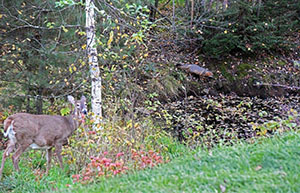 Vor dem Fenster fraß ein Reh Gras und beobachtete irgendetwas in einiger Entfernung. Was immer es war, es verängstigte es nicht. Es bewegte sich weiter. Dann sahen wir einen der Graufüchse aus dem langen Gras und um den Teich herum rennen. Ich fing an zu fotografieren. Das Reh achtete, statt auf den Fuchs, auf die Kamera. Weiß es nicht, dass es nicht in die Kamera schauen sollte?