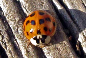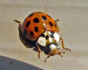 Vor dem Fenster hat heute die jährliche Invasion von Asiatischen Marienkäfern (Harmonia axyridis) begonnen. Sie wurden in einigen Staaten eingeschleppt, aber sie haben sich weit verbreitet und bekamen sehr zahlreich. Sie mögen es in Häusern zu überwintern. Wir sehen kaum noch die einheimischen Marienkäfer. Die zwei Bilder zeigen einige Variationen der Farbmuster der Asiatischen Marienkäfer, besonders die M-förmige Markierung auf dem weißen Grund hinter dem Kopf.