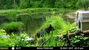 Sie könnten ein Geheimnis gelöst haben. Als wir Quill im letzten Mai, am 24. sahen, fragten wir uns, wie er 89 Pfund wiegen konnte, was 26 Pfund schwerer war, als dem, als er uns nach Mitternacht am frühen Morgen des 18. November 2016 verlassen hat. Normalerweise ging er nicht am Quillhaus, das wir aufgestellt hatten, vorbei. Aber einmal ging er vorbei. Die Pfadkamera fing ihn beim Vorbeigehen dieses (ungenutzten) Hauses mit seiner Nase nach oben gerichtet am 10. Mai 2017 um 15:11h vorbei. Er war hier wochenlang hergekommen bevor wir sein Gewicht aufgenommen hatten! Dank auch an Peggy Stubbs für ihr sich Kümmern um Quill im letzten Herbst und für das Einsetzen von neuen Batterien in diese Pfadkamera, um zu sehen, ob sie ein Bild von ihm aufnehmen würde. Wir haben Glück am Bären Zentrum und dem Wildtier Forschungsinstitut, dass wir so engagierte Menschen dort haben, deren Passion es ist, neben unseren Mitarbeitern, die Wahrheit über Bären zu lernen und als Volontäre weiterzugeben