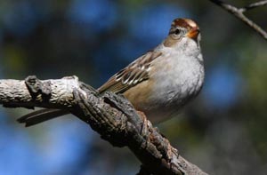 Weißscheitelammern ziehen zusammen mit Weißkehlammern und Winterammern durch. Die Fotos zeigen eine erwachsene Weißscheitelammer mit ihrer weißen Krone und einen jugendlichen mit seiner hellbraunen Krone.