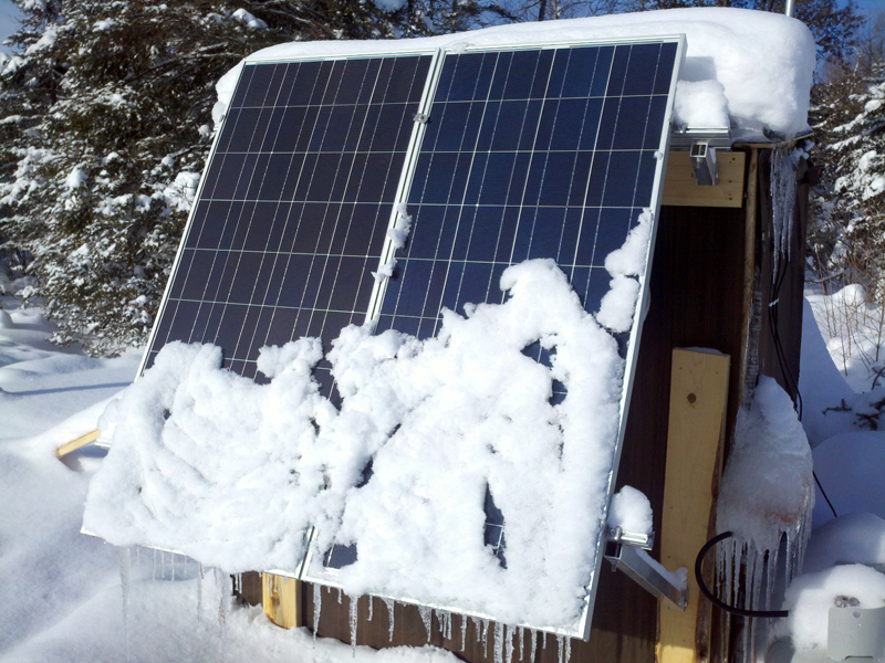 Der Jammerton ist weg. Daumendrücken, aber seit Jason den Lärmfilter, den Bill Powers von PixController geschickt hat, eingebaut hat, haben wir das nicht mehr gehört. Heute war der Test. Heller Sonnenschein. Kein Jammerton. Doch vielleicht waren die Solarpaneele von Schnee bedeck. Super Jason fuhr hin und schaute nach und machte dieses Bild. Nicht genug Schnee wie um früher diesen Jammerton zu erzeugen. Wir denken, dass der Jammerton verschwunden ist.