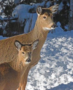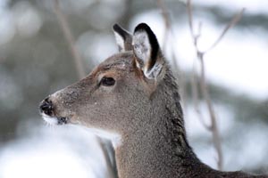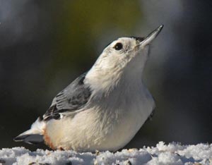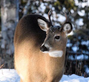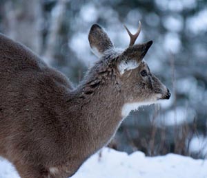 Der Flughafen in Ely meldete heute früh minus 33F, Vögel plusterten sich auf und hatten Frostspuren an ihren Augen. Sie sahen unglücklich aus während sie Samen fraßen und dann anhielten, um sich aufzuplustern. Zehn Rehe sammelten sich und wetteiferten um 100 Pfund Mais neben dem Dattelmash. Der mit dem gebrochenen Geweih war besonders munter, als er versuchte Rehe zu vertreiben, die schnell wieder zurückkamen. Um die Rehe zu bedrohen senkte er seinen Kopf und bewegte ihn, wobei sein Geweih schwang. Rehe konkurrieren indem sie sich hinstellen und mit ihren Hufen scharren. Weder der mit dem gebrochenen Geweih noch irgendein anderes nahmen Kontakt auf. Raben können in Ely halbzahm sein, sind aber eine der vorsichtigsten Vögel im Wald. Es war interessant einen zu beobachten der ein vorbeigehendes Reh ignorierte.