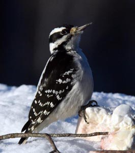 Vor dem Fenster ist an diesem kalten Tag, der mit minus 26F begann und bis zu minus 1F ging, gab der Haarspecht einen guten Blick auf seinen definitiv weißen, ungestreiften Bürzel, der Kumpel des Bocks mit dem gebrochenen Geweih, der mit dem Gabelgeweih, war friedlich hier und nagte seinen Anteil an Dattelmash von dem hart gefrorenen Block; und das Haarspecht Weibchen präsentierte eine Trimmerfigur vor der Kamera als sie ihren Anteil an Talg zu sich nahm.