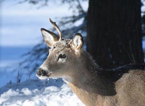 Der große 10-Ender hat noch beide Geweihteile. Er kam heute mit verschneitem Gesicht, da der Schnee auf sein Gesicht gefallen war, als er einen verschneiten Zweig anstieß.