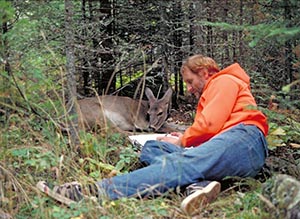 Mir gefiel die Idee von völlig freilebenden Rehen akzeptiert zu werden, die ihren Lebensraum selbst auswählen konnten und zeigen können, was sie das Jahr über fressen. Es gab sehr wenige Daten über die Ernährungsgewohnheiten im Sommer. Es machte Spaß und war aufschlussreich Meine Assistenten und ich fütterten junge Kitze mit der Flasche und ließen sie frei laufen. Sie kamen beim Geräusch von klirrenden Flaschen angerannt. Wir stimulierten ihre Hinterteile, damit sie urinieren konnten und Stuhlgang hatten und wir führten Rektalthermometer ein, um sie daran zu gewöhnen. Wenn ein Reh ruhte, wenn einer von uns anfing eine 24-Stunden-Datenaufzeichnung zu machen, schlief das Reh weiter oder wiederkäute. Wenn das Reh fraß, pausierte es lange genug um einen Arm zur Begrüßung zu lecken und dann weiter zu fressen. Wir wurden Experten darin, halbwüchsige Pflanzen zu identifizieren, bevor sie im Rachen eines Rehs verschwanden. Wir sahen, wie sie ihre Zeit Tag und Nacht verbrachten in allen Jahreszeiten. Im Winter brachten wir Schlafsäcke in unseren Rucksäcken mit. Nachdem ich das ein Jahr lang gemacht hatte, wusste ich mehr über Rehe als ich über Bären in einem Jahrzehnt mit Senderpunkten auf Karten und durch das Vermessen von betäubten Bären gelernt hatte. Sobald ich genug über das überraschende Losstürzen und die Drohgebärden von Schwarzbären gelernt hatte, um zu wissen, dass ich in Sicherheit war, fing ich an Bären zu begleiten, um endlich die Details ihres Lebens zu erfahren. Sie kennen den Rest der Geschichte. Das Bild ist von 1979.